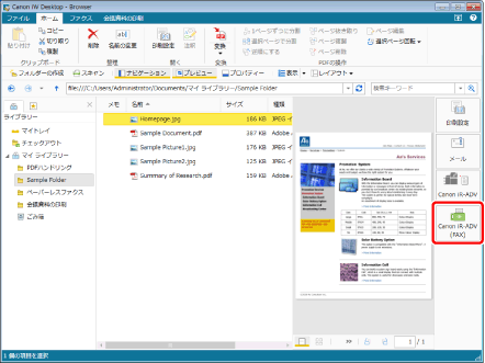Desktop Browser画面のアウトプットバーからファクスを送信するには、アウトプットバーにファクスアウトプットボタンを登録しておく必要があります。また、Desktop Browser画面から外部アプリケーションを使用してファクスを送信するには、ファクスアウトプットボタンの設定で[文書に関連付けられたアプリケーションでファクス送信する]が選択されている必要があります。ボタンの登録方法、設定方法については、次を参照してください。