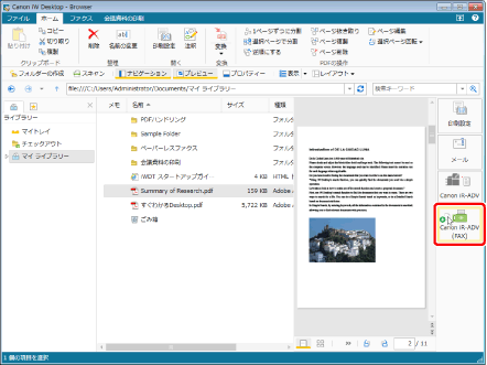 ページ編集モードの画面からも同様の操作で選択したページをファクス送信できます。ページ編集モードの画面では、