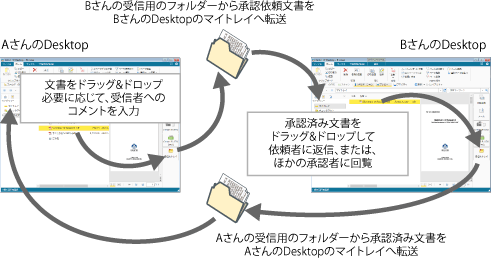 文書の送受信は、Desktop Browser画面のアウトプットバーに登録した送信先トレイアウトプットボタンと、ナビゲーションウィンドウの[ライブラリー]にあるマイトレイを使います。送信先トレイアウトプットボタンにドラッグ&ドロップした文書は、相手側のマイトレイに転送されます。マイトレイに届いた文書を、必要に応じて編集し、再度送信することで文書を回覧できます。