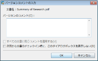 Document Serverライブラリーがバージョン管理を行う設定の場合、ライブラリー内の文書を登録する際、および更新する際に[バージョンコメントの入力]ダイアログボックスが表示されます。