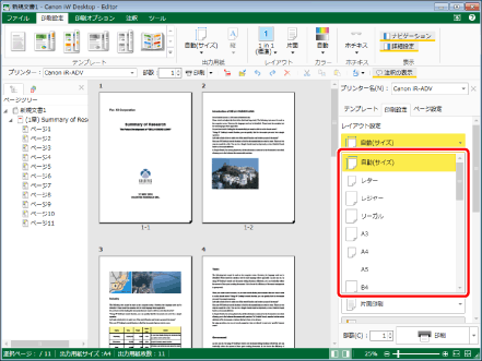 原稿の向きやサイズの異なる原稿が混在する文書の出力用紙サイズを[自動(サイズ)]以外に設定した場合、原稿は設定された用紙幅に合わせて自動的に拡大/縮小されます(原稿ページは自動的に回転されません)。