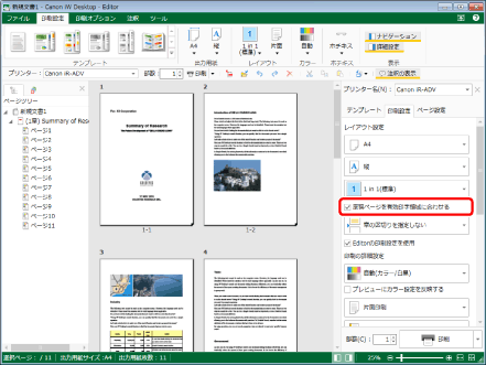 出力用紙サイズの設定で[自動(サイズ)]を選択し、[原稿ページを有効印字領域に合わせる]にチェックマークを付けずに印刷を行う場合、原稿ページごとに自動的に選択される出力用紙サイズが原稿サイズよりも小さい場合があります。このとき、出力用紙サイズを超える範囲は印字されない場合があります。