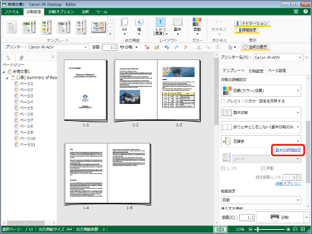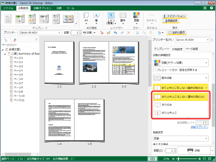 キヤノン製プリンターを選択し、詳細ウィンドウの[印刷設定]タブ、リボンのコマンド、ツールボタンのいずれかで、[Editorの印刷設定を使用]にチェックマークを付けた場合に設定できます。
