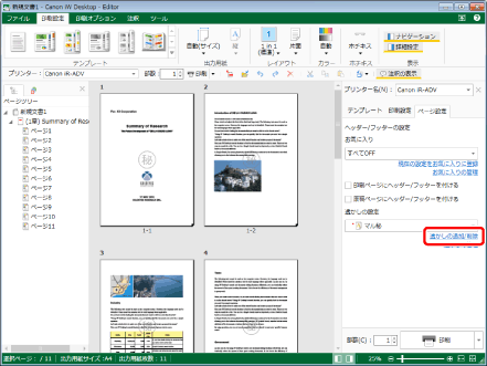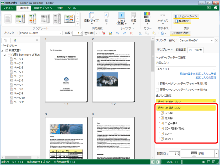 詳細ウィンドウの[ページ設定]タブで、[透かしの追加/削除]をクリックして表示される[透かしの追加/削除]ダイアログボックスの[設定済みの透かし]に複数追加した場合は、詳細ウィンドウ > [ページ設定]タブの透かしのプルダウンリストが[ユーザー設定]に変わります。