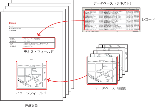ページ上の差し替える部分を「差し込みフィールド」といい、文字の差し替えを行う「テキストフィールド」と、イメージの差し替えを行う「イメージフィールド」を設定できます。差し込みフィールドの設定は、Desktop Editorの差し込み印刷設定モードで行います。差し込み印刷の設定を文書に保存する場合は、文書をIWB形式(*.iwb)で保存します。