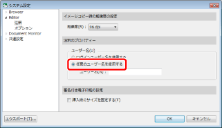 コンピューターにログインしているユーザー名を使用する場合、[システム設定]で[ログインユーザー名を使用する]を選択します。