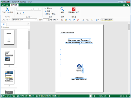 ワークウィンドウでオブジェクトを選択すると、選択されているオブジェクト総数とテキストオブジェクト数がステータスバーに表示されます。