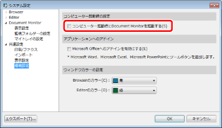 [ファイル]メニュー > [オプション] > [システム設定] > [共通設定] > [環境設定] > [コンピューター起動時にDocument Monitorを起動する]