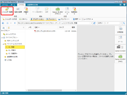 Desktop Browser画面のナビゲーションウィンドウ、またはファイルリストビューウィンドウで監視対象にするフォルダーを選択します。
