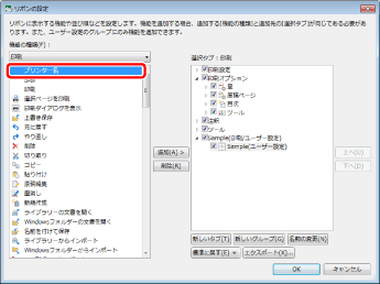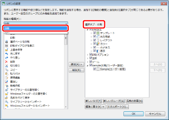 選択したモードに属するコマンド/グループが、左側の一覧に表示されます。