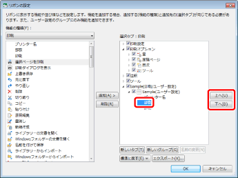 タブの並び順を変更する場合は、右側の一覧から並び順を変更するタブを選択して、[上へ]/[下へ]をクリックします。
