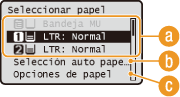(Selección de papel/Opciones) para seleccionar el papel que desea utilizar en la pantalla <Seleccionar papel>. Asimismo, puede pulsar esta tecla para cambiar la configuración del papel cuando cargue un tipo o tamaño de papel diferente al tipo o tamaño de papel cargado anteriormente. Tenga en cuenta que la configuración del papel debe especificarse correctamente para que el papel se introduzca sin problemas.