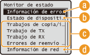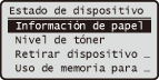 Muestra el estado del equipo, como la cantidad de papel o tóner restante.