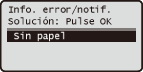 En algunos casos, cuando se produce un error, aparecen las instrucciones sobre cómo responder ante dicho error. Siga las instrucciones de la pantalla para solucionar el problema. La pantalla que aparece cuando se produce un atasco de papel se muestra a continuación a modo de ejemplo (