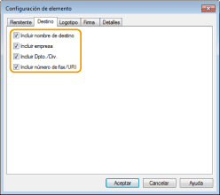 Seleccione los elementos de destino que desee incluir e introduzca la información. Los nombres de destinos, los nombres de empresas, los nombres de departamentos y los números de fax especificados en la pestaña [Seleccionar destino]/[Introducir destino] (