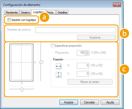Especifique todos los ajustes. La siguiente pantalla muestra un ejemplo de cuando se selecciona la pestaña [Logo].
