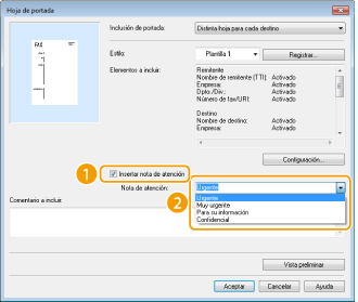 Dispone de notas de atención como "Urgente" y "Confidencial." También puede introducir caracteres directamente en [Nota de atención] en lugar de seleccionar una nota de la lista.