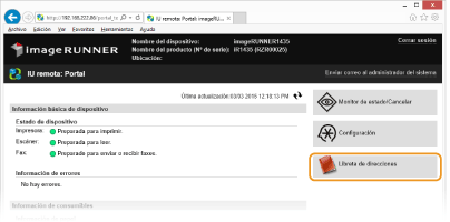 Esta sección describe cómo registrar los destinos del e-mail y el servidor de archivos utilizando la IU remota. Los destinos del servidor de archivos solo pueden registrarse a través de la IU remota.