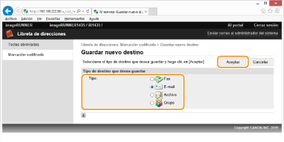 Seleccione [E-mail] o [Archivo] en [Tipo de destino que desea guardar] y haga clic en [Aceptar].