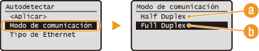 seleccione <Half Duplex> o <Full Duplex> .![]() <Half Duplex>Envía y recibe datos de comunicación de forma alternativa. Seleccione cuándo se conecta el equipo a un dispositivo de red utilizando half-duplex.