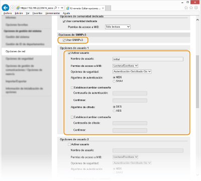 Seleccione la casilla de verificación [Activar usuario] y especifique las opciones [Nombre de usuario], [Permiso de acceso a MIB] y [Opciones de seguridad].