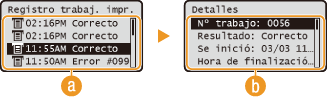 .![]() <Registro trabaj. impr.>Muestra la lista de documentos impresos. <Correcto> aparece cuando un documento se imprime correctamente, y <Error> aparece cuando un documento no se imprime correctamente porque se canceló o se produjo algún error.