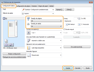 Seleccione el tamaño del papel en [Tamaño de salida]