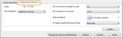 Haga clic en la pestaña [Configuración de impresión] para mostrar la pantalla de especificación de las opciones de impresión, como el número de copias o la impresión a una cara/doble cara. Las opciones especificadas aquí se aplican a todo el trabajo de impresión.