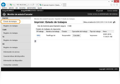 Haga clic en [Nº trabajo] en los documentos pausados para mostrar información detallada como el nombre de usuario y el número de páginas del documento.
