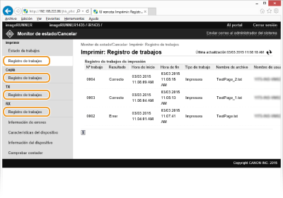 Cuando haya habilitado Administración de ID de departamento, aparecerán todos los documentos de impresión actualmente procesados, independientemente del ID de departamento en el que inició sesión.