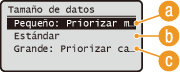 Puede especificar la escala de compresión del archivo que se utiliza cuando los documentos se escanean en el formato de archivo especificado (Selección de un formato de archivo). <Pequeño: Priorizar memoria> aumenta la escala de compresión más de lo normal para crear archivos más pequeños con una calidad de imagen inferior. Por otro lado, <Grande: Priorizar calidad de imagen> reduce la escala de compresión más de lo normal para crear archivos más grandes con una calidad de imagen superior.