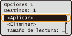 Si desea editar una opción registrada, pulse   <Opciones favoritas>    <Editar/Eliminar>    seleccione la opción    edite la opción    <Aplicar>    <Sí>  . No puede cambiar los destinos registrados en la opción con este procedimiento. Registre una nueva opción con los destinos deseados.