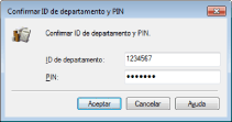 Haga clic para verificar que ha introducido el ID y el PIN correctos. Esta función no está disponible si el equipo y el ordenador están conectados a través de un puerto USB o WSD (Servicios web en dispositivos). [Confirmar ID de departamento/PIN al imprimir]/[Confirmar ID de departamento/PIN al enviar fax]