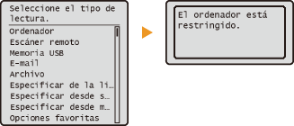 Si se selecciona la casilla de verificación [Lectura], se deshabilitará el escaneado de documentos en dispositivos de memoria USB, e-mails y servidores de archivos. También puede deshabilitar el escaneado de documentos en ordenadores a través de <Ordenador> y <Escáner remoto>. Sin embargo, solo podrá deshabilitar el escaneado de documentos en ordenadores para todos los ID de departamento. (Bloqueo de trabajos cuando el ID de departamento es desconocido).