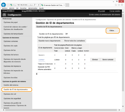Haga clic en el vínculo de texto correspondiente situado debajo de [ID de departamento:] para realizar cambios.