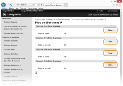 Comprobación de los errores de entrada Si las direcciones IP se introducen de forma incorrecta, es posible que no pueda acceder al equipo desde la IU remota, en cuyo caso deberá establecer <Filtro de direcciones IPv4> o <Filtro de direcciones IPv6> en <Off>. Filtro de direcciones IPv4 Filtro de direcciones IPv6