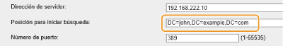 Al especificar el nodo, introduzca "DC=", seguido de un nombre de host (cadena de caracteres delimitados por puntos en el nombre de dominio de Active Directory), y separe cada una de las entradas con una coma. Si el nombre de dominio es "john.ejemplo.com", por ejemplo, introduzca "DC=john,DC=ejemplo,DC=com."
