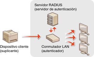 El equipo puede conectarse a una red 802.1X como dispositivo cliente. Una red 802.1X normal está formada por un servidor RADIUS (servidor de autenticación), un conmutador LAN (autenticador) y dispositivos cliente con software de autenticación (suplicantes). Si un dispositivo intenta conectarse a la red 802.1X, el dispositivo deberá autenticar al usuario para demostrar que la conexión pertenece a un usuario autorizado. La información de autenticación se envía y se comprueba a través de un servidor RADIUS, que permite o rechaza la comunicación con la red en función del resultado de la autenticación. Si en la autenticación no se obtienen los resultados esperados, un conmutador LAN bloquea el acceso desde el exterior de la red.