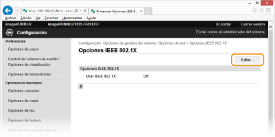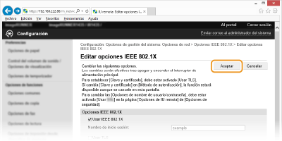 Seleccione la casilla de verificación [Usar IEEE 802.1X], introduzca el nombre de inicio de sesión en el cuadro de texto [Nombre de inicio sesión:] y especifique las opciones necesarias.