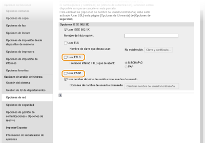 Las opciones necesarias son casi las mismas que las de TTLS. MSCHAPv2 se utiliza como protocolo interno. Habilite TLS para la IU remota antes de configurar este método de autenticación (
