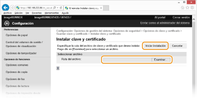 Los pares de claves y los certificados digitales pueden obtenerse con la ayuda de una entidad de certificación (CA) y utilizarse con el equipo. Puede guardar y registrar estos archivos utilizando la IU remota. Asegúrese de que el par de claves y el certificado cumplan los requisitos del equipo (