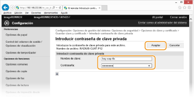 [Contraseña:] Introduzca hasta 24 caracteres alfanuméricos en la contraseña de la clave privada establecida en el archivo que desee registrar.
