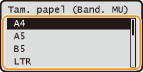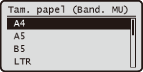 Si la pantalla anterior no aparece cuando hay papel cargadoSi siempre carga el mismo papel en la bandeja multiuso, puede omitir las operaciones de configuración del papel registrando el tamaño y el tipo de papel como opción predeterminada. Sin embargo, si se registra la opción predeterminada, la pantalla anterior no aparecerá. Para visualizar la pantalla, seleccione <Off> para <Guardar opc. prefijada> (Registro de la configuración del papel predeterminada para la bandeja multiuso).
