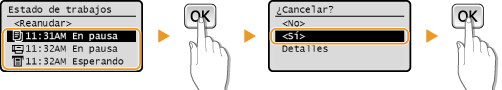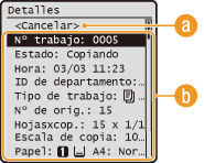 Podrá visualizar el número de copias, la configuración y otros detalles. Si solo desea consultar los detalles sin cancelar la copia, pulse
