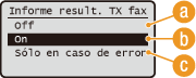 Si selecciona <On> o <Sólo en caso de error>, una parte de un documento de fax puede incluirse en el informe. Establezca <Incluir imagen TX> en <On> y pulse  .