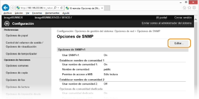 Si ambas versiones de SNMP están habilitadas, se recomienda establecer el permiso de acceso a MIB de SNMPv1 en [Sólo lectura]. El permiso de acceso a MIB puede establecerse de forma independiente en SNMPv1 y SNMPv3 (y para cada usuario en SNMPv3). Si selecciona [Lectura/Escritura] (permiso de acceso completo) en SNMPv1 se invalidan las sólidas opciones de seguridad que caracterizan a SNMPv3, ya que la mayoría de las opciones del equipo pueden controlarse con SNMPv1.