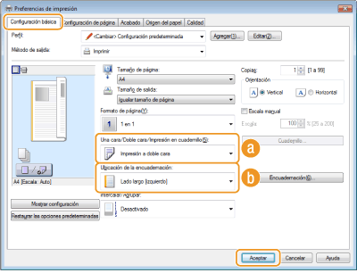 Seleccione [Impresión a una cara] o [Impresión a doble cara] en [Una cara/Doble cara/Impresión en cuadernillo]