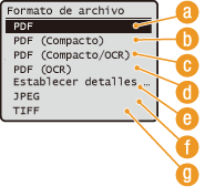 Puede elegir entre seis formatos de archivo para convertir los documentos: <PDF>, <PDF (Compacto)>, <PDF (Compacto/OCR)>, <PDF (OCR)>, <JPEG> y <TIFF>. Los documentos escaneados se convierten en el formato de archivo especificado aquí y, a continuación, se envían al destino especificado.