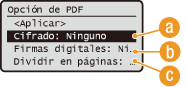 Seleccione esta opción para especificar los ajustes para la generación de un PDF cifrado con firma digital. También puede especificar si desea dividir varias imágenes en archivos separados al enviarlas por correo electrónico o almacenarlas en un servidor de archivos.