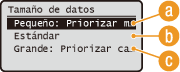 Puede especificar la escala de compresión del archivo que se utiliza cuando los documentos se escanean en el formato de archivo especificado (Selección de un formato de archivo). <Pequeño: Priorizar memoria> aumenta la escala de compresión más de lo normal para crear archivos más pequeños con una calidad de imagen inferior. Por otro lado, <Grande: Priorizar calidad de imagen> reduce la escala de compresión más de lo normal para crear archivos más grandes con una calidad de imagen superior.